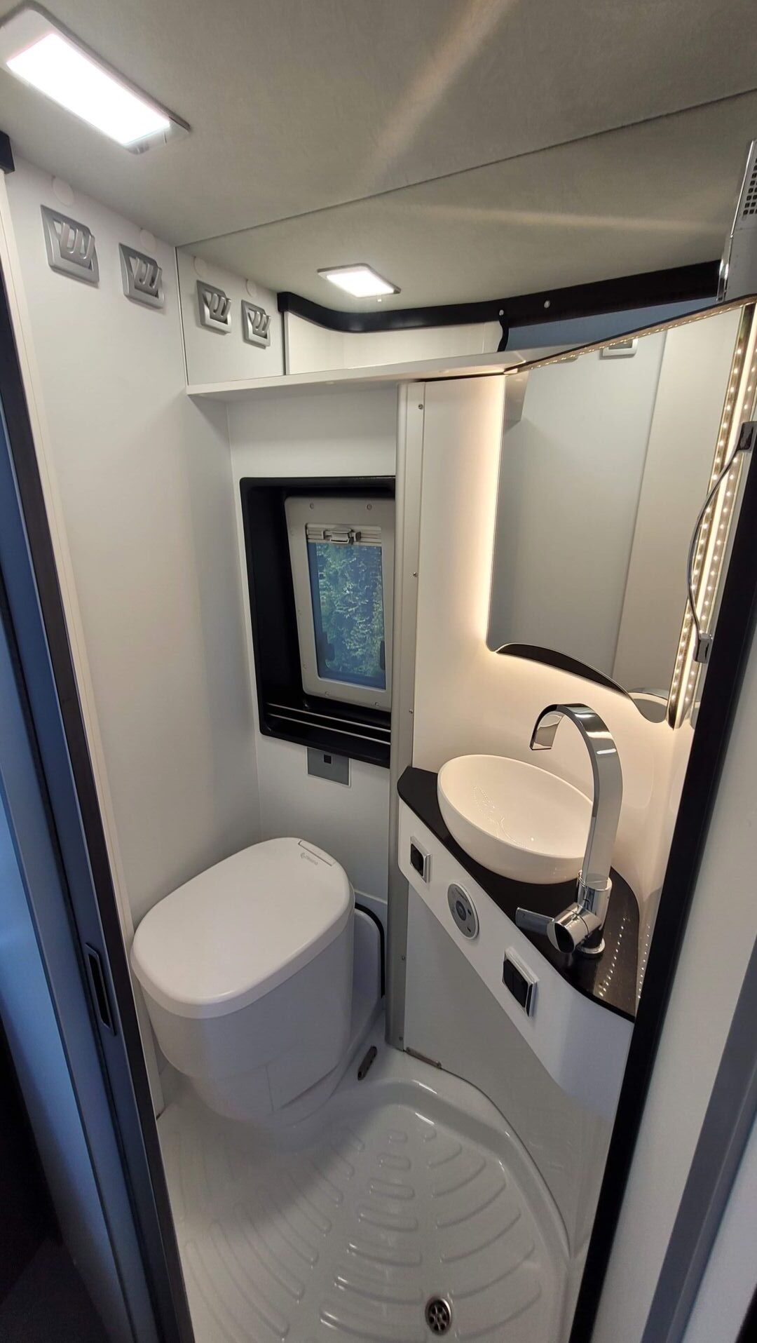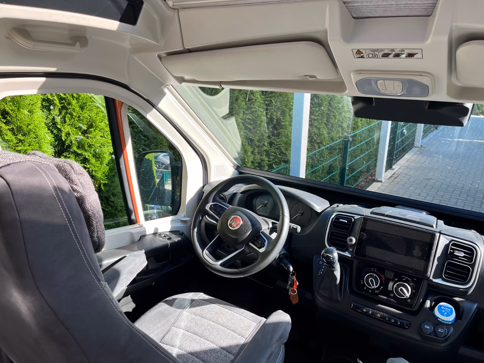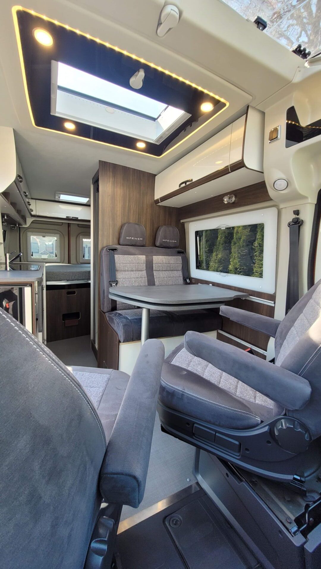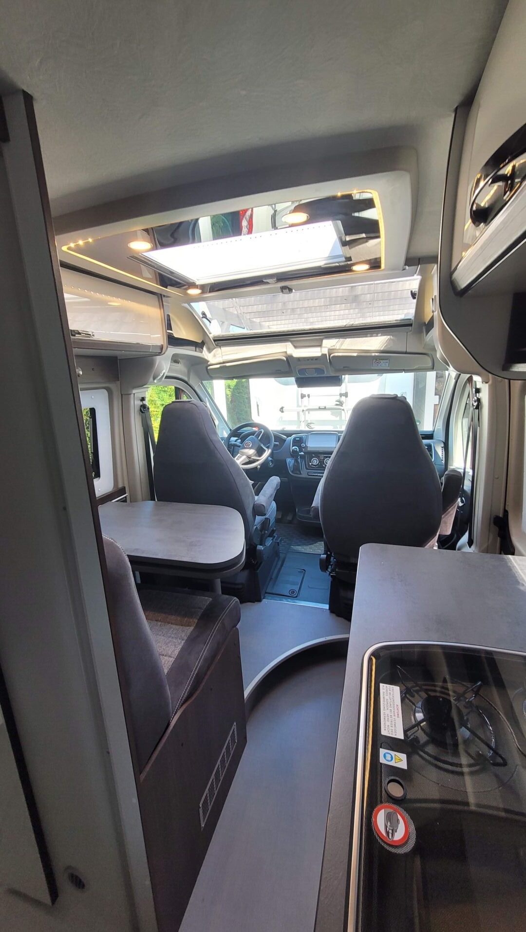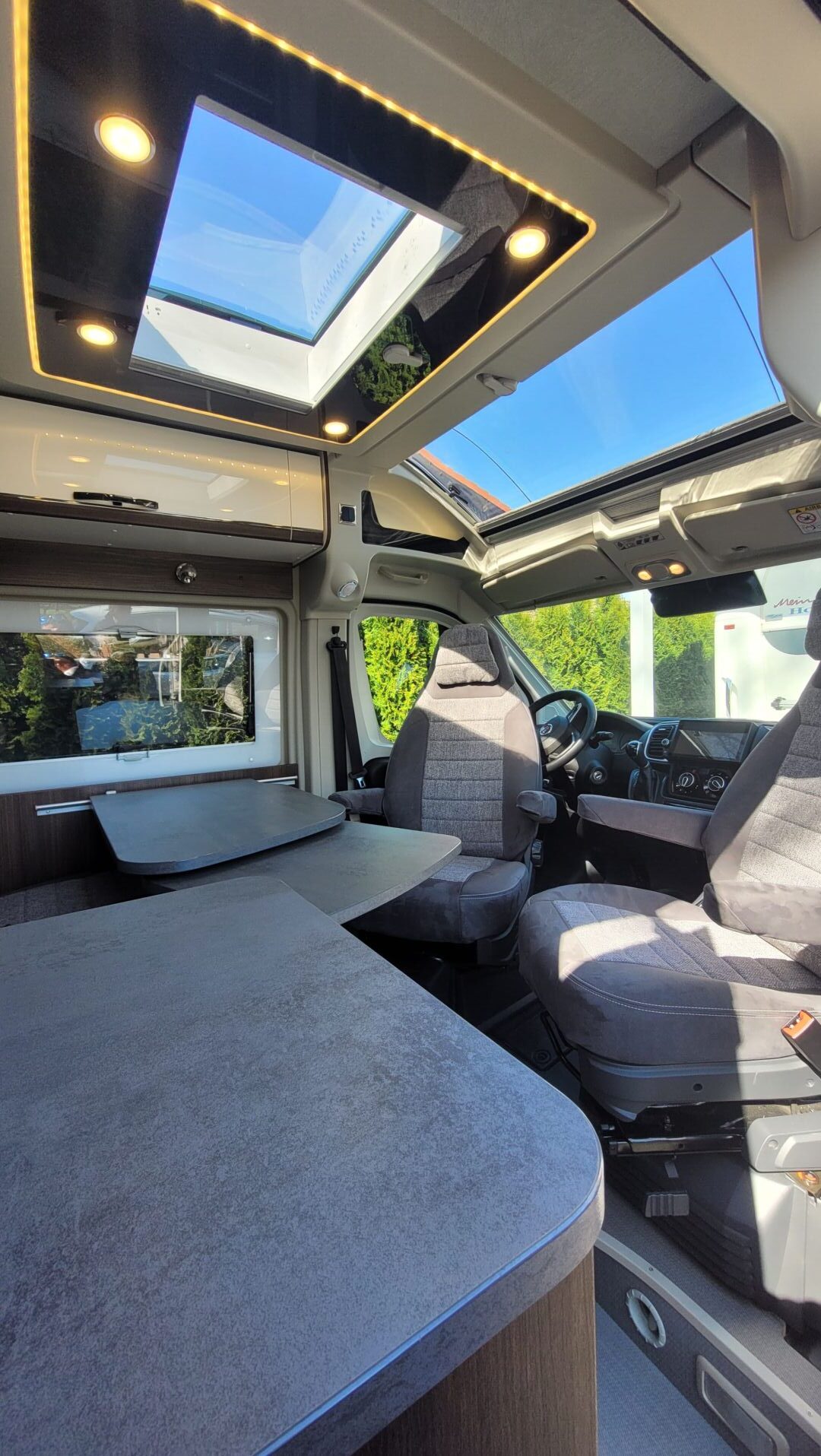 - drehbarer Fahrer- und Beifahrersitz sowie feste Sitzbank, erweiterbare Tischplatte